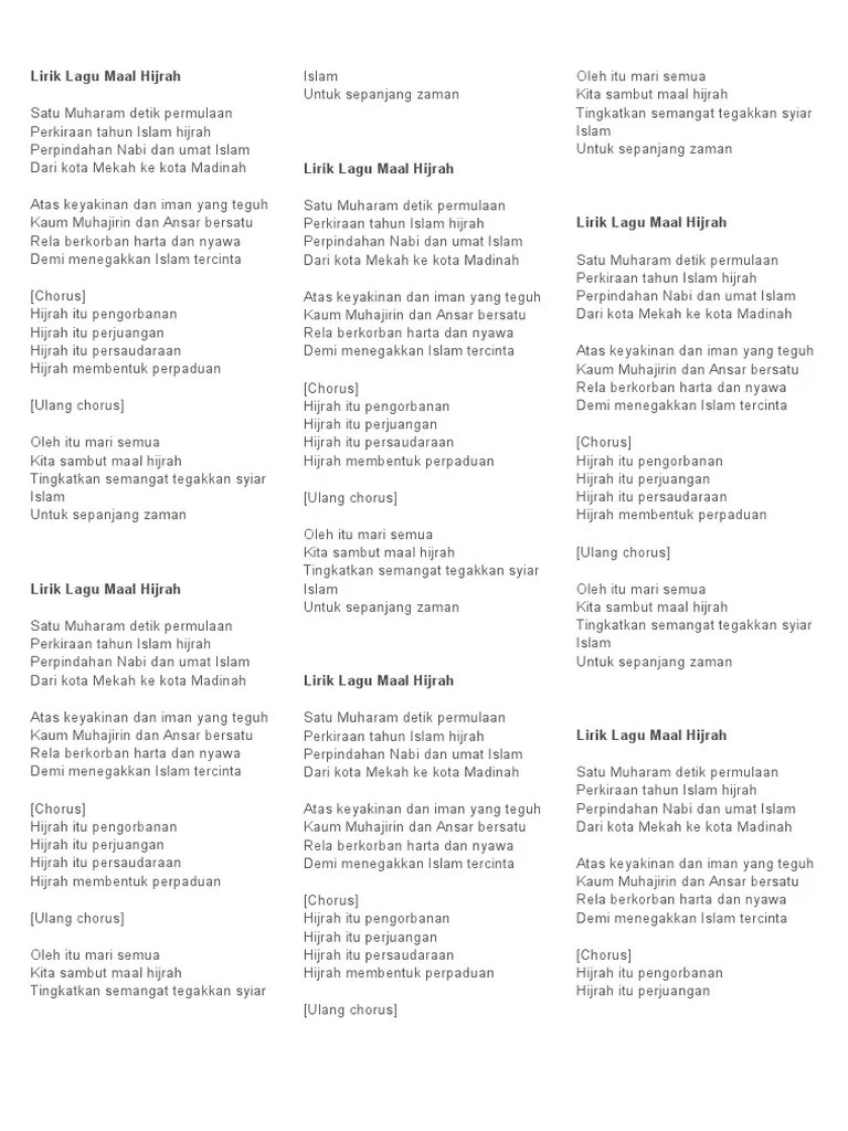 Lagu yang berkumandang setiap kali sambutan maal hijrah diadakan.saya pun tak tahu tahun bila lagu ni dibuat tapi dari zaman sekolah saya lagi lagu ni dah popular.versi yang lagu ini terkandung dalam koleksi nasyid terbitan jakim 2002.saya tak pasti siapa pencipta dan penulis lirik asal lagu ini. Lirik lagu lagu hijrah mp3 terpopuler full album terlengkap. Download mp3 lagu hijrah gratis, ada 20 daftar lagu lagu hijrah yang bisa anda download. Savesave lirik lagu sambutan maal hijrah for later. List download link lagu mp3 al ajiba maal hijrah by (babymalaysia), last update jun 2018. 19 august 2020 / zam rilek. Download mp3 maal hijrah dan video mp4 gratis. Tetes air mata yang selalu membasahi di setiap doaku sembah sujud padamu, memohon ampunanmu terimalah taubatku ya allah. Al ajiba maal hijrah mp3 & mp4. Download lagu maal hijrah (3.22mb) dan streaming kumpulan lagu maal hijrah (4.53mb) mp3 terbaru gratis dan enak dinikmati, video download lagu maal hijrah mp3 dapat kamu download secara gratis di lagu.untuk melihat detail lagu maal hijrah klik salah satu judul yang cocok. Atas keyakinan dan iman yang teguh kaum muhajirin dan ansar bersatu rela berkorban harta dan nyawa demi menegakkan islam tercinta chorus hijrah itu pengorbanan. Kamu juga bisa download secara legal di. Berikut ini lirik lagu 'bahagialah bersamanya' milik selvata yang dirilis pada 6 september 2020 di kanal youtube selvata official.