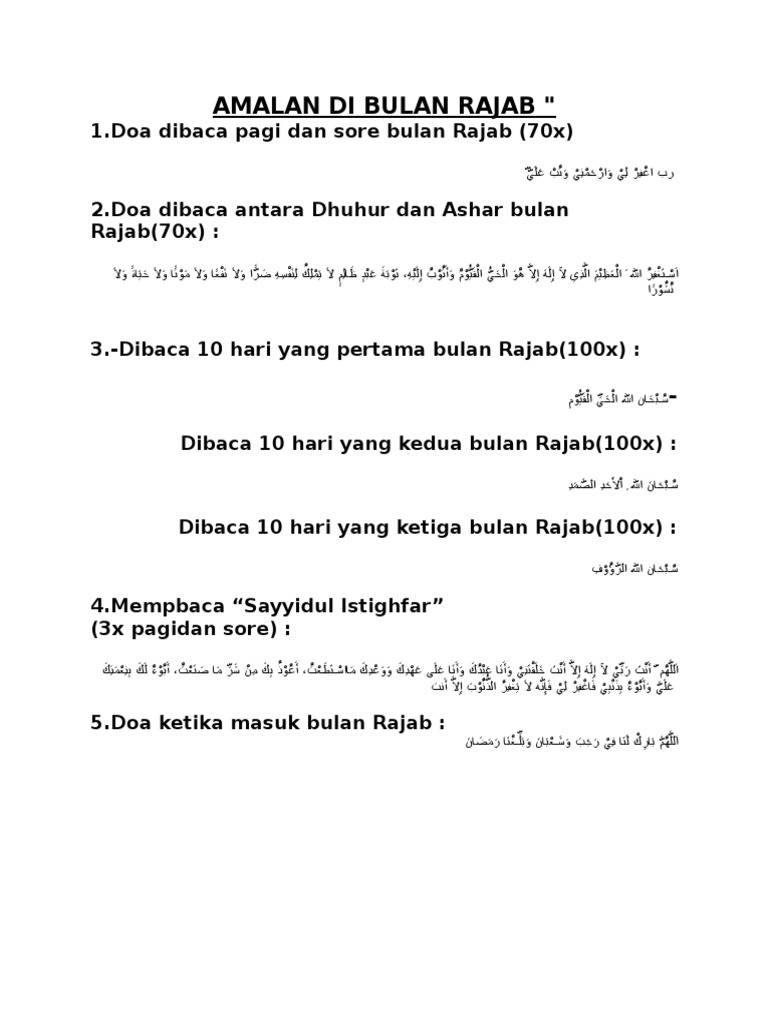 Tiada amalan khas yang mesti dilakukan pada bulan rejab. Dari abu bakroh, nabi shallallahu 'alaihi wa sallam bersabda Salah satu amalan bulan rajab adalah puasa. Salam 1 rejab untuk semua pembaca blog santai. Di bulan rajab dianjurkan untuk memperbanyak amal ibadah.